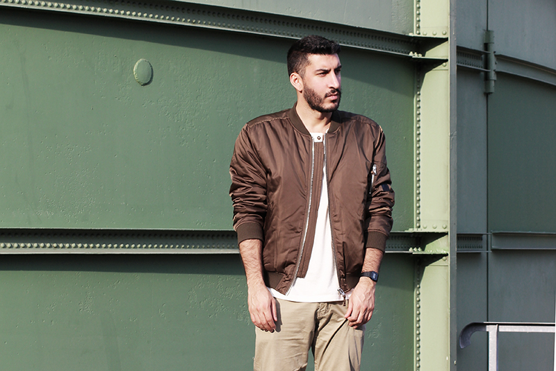 Dieser Look besteht aus Stücken, mit Farben aus ähnlichen Farbfamilien, doch keines der Farben hat den gleichen Farbton. Genau aus diesem Grund mag ich solche Kombinationen – Man muss fast nichts beachten und der Look steht. Wie sollte es sonst sein? Wenn das Wetter macht was es will, machen wir auch was wir wollen. Gemixt wurde ein klassischer Chino und Shirt zur sportlichen Bomberjacke. Komplettiert wird der Look, den Erdtöne dominieren, mit passenden Militär-Grünen Adidas Tubular Strap für die sommerlichen Lauf.