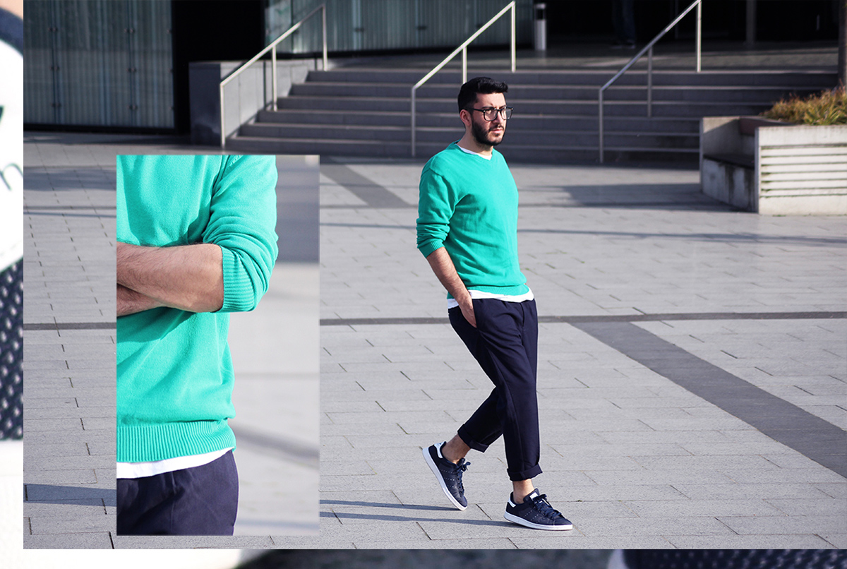 Denn das Wetter war perfekt für den Pullover aus London. Kombiniert zur tiefblauen Stoffhose und gleichfarbigen Sneakern von Adidas, ist der Look für kühle S/S- Tage bestens geeignet.